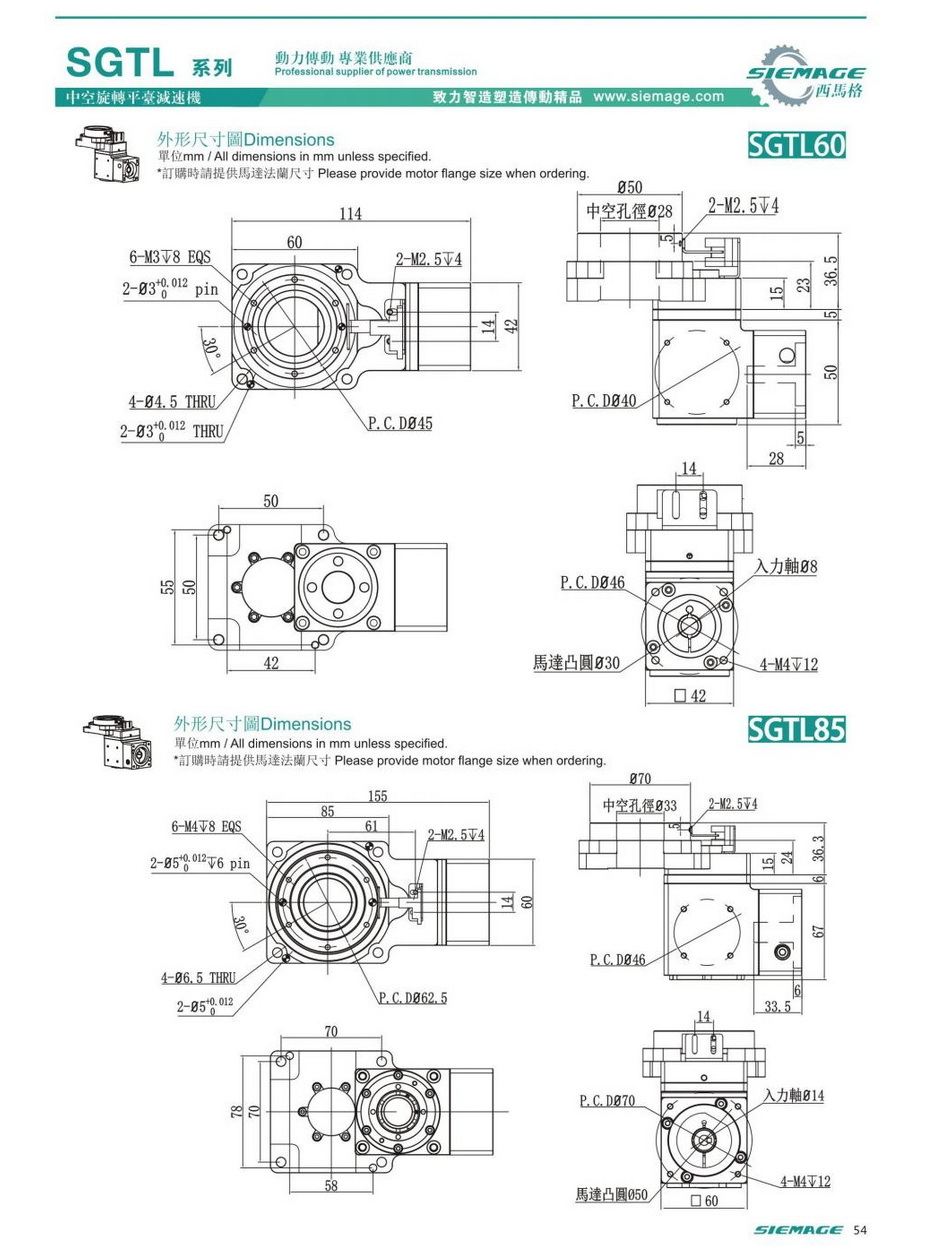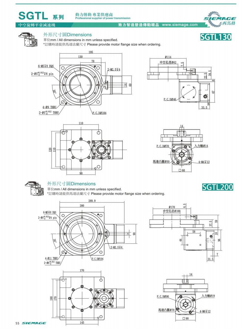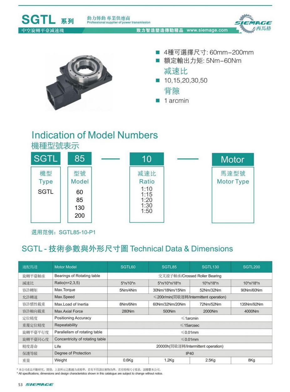 西马格直角中空旋转平台型号SGTL60,SGTL85,SGTL130,SGTL200.可配各品牌伺服电机,伺服马达,各厂家步进马达,步进电机。减速比有多种选择。