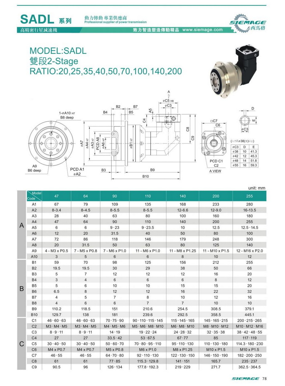 西马格直角行星减速机7种可选尺寸:47MM-255MM
